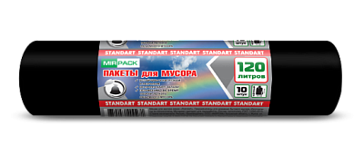Мешки для мусора 120 л. 18 мкм, ПСД, 10 шт., черные, материал высокого давления, усиленные