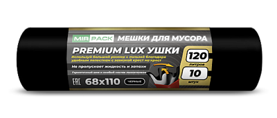 Мешки для мусора с ушками 120 л, 10 шт, 20 мкм, черные, размер 68*110 см, серии «Premium Lux Ушки»