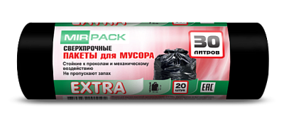 Пакеты для мусора 30 л, 12 мкм, ПНД, черные, в рулоне 20 шт, 50х60 см, особопрочные, MIRPACK