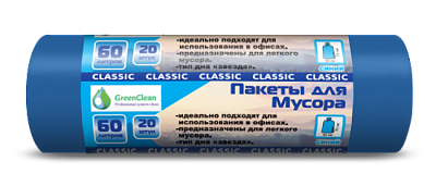 Мешки для мусора 60 л, 7 мкм, синие, в рулоне 20 штук, 60х70 см, GreenClean