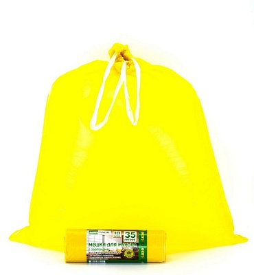 Мешки для мусора с завязками 35 л, 30 мкм, 10 штук, ПCД, желтые, для тяжелого и острого мусора прямое дно + ленты для затягивания